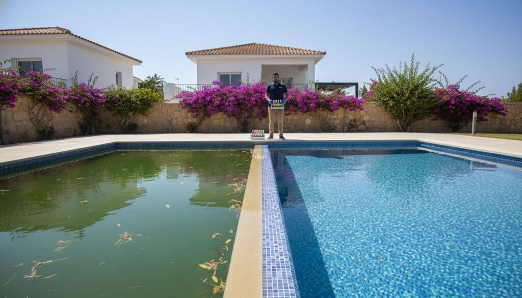 While some minor cloudiness can be a DIY task, certain situations demand immediate expert intervention. If you spot small, dark spots, you may have ‘Black Algae,’ a highly resistant strain with roots that penetrate pool surfaces, making it immune to standard shock treatments. A green pool in Paphos can also be a symptom of critical equipment failure, like a broken pump or a clogged filter. Finally, if you have guests arriving at your Peyia villa in 48 hours, a professional turnaround is your only guaranteed solution.