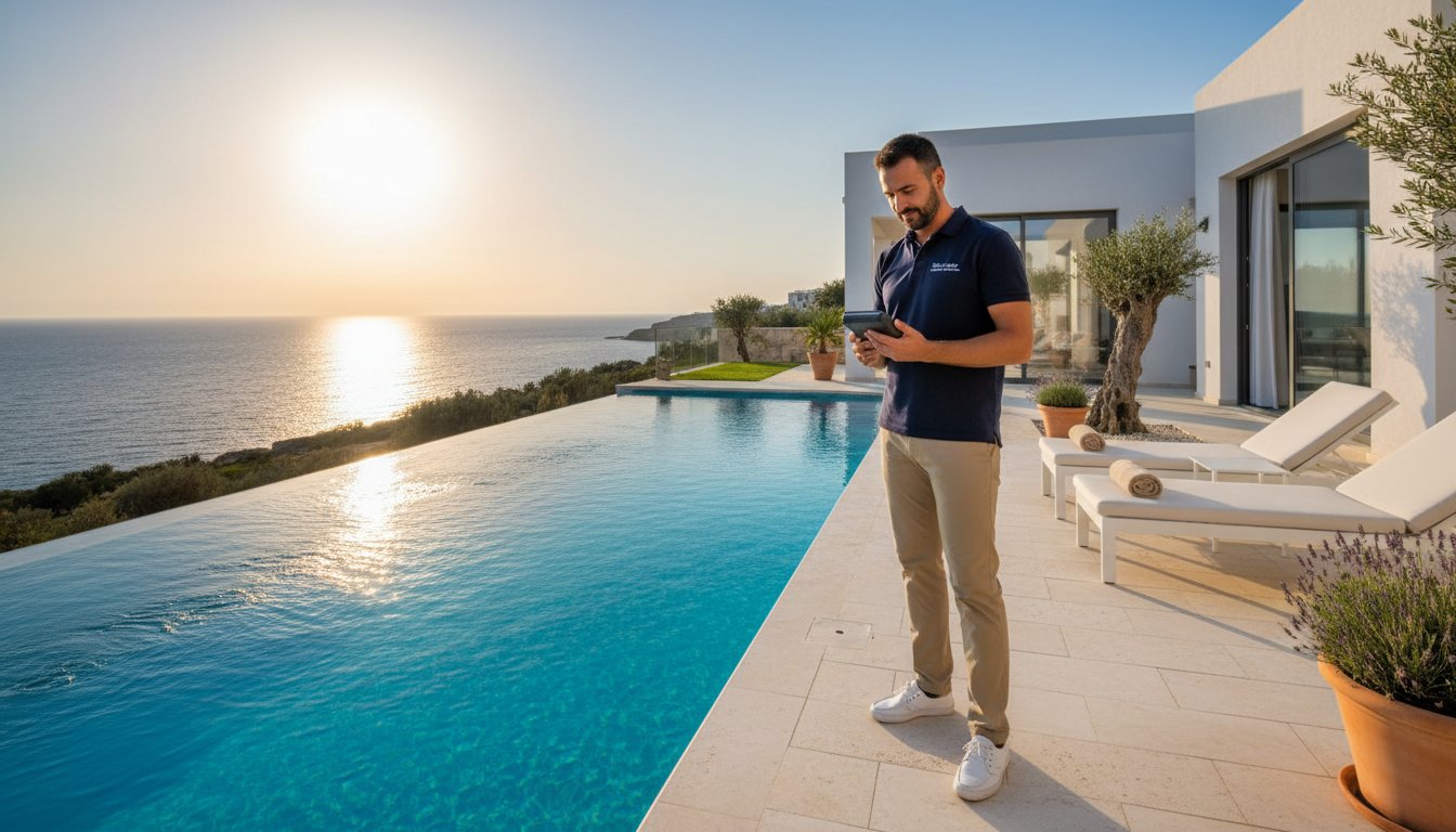 - Precision chemical dosing that accounts for the specific mineral profile of Peyia’s water supply.